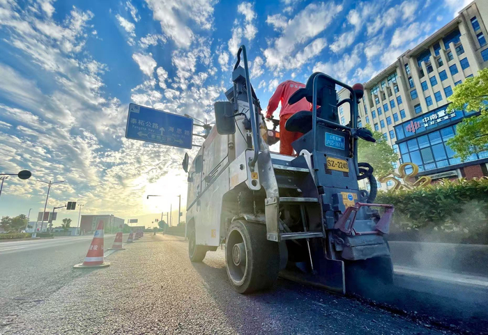 铣刨机上场。劳动报记者 胡玉荣 摄影王国良驾驶铣刨机来到破损路面,随着马达的轰鸣,破损的路面被精准切割下来。随后,清扫车上场,高效吸走碎渣,倒入停在一旁的废料运输车。
