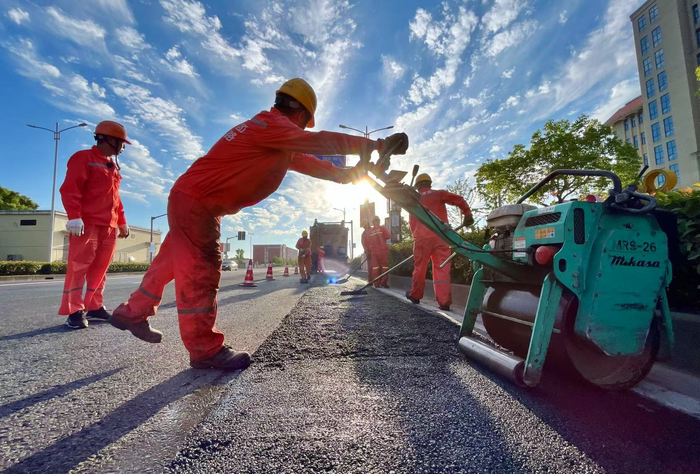 工友推着小型压路机压实路面。劳动报记者 贡俊祺 摄影此时,有工友推着小型压路机,在新铺的沥青路面上沉稳地来回碾压。每一次钢轮滚过,新铺的黑色路面便向下压实一分,变得平整、光亮,与旧路面紧密咬合。秦加强又紧随压路机之后,再次弯腰仔细检视着接缝、平整度、密实度。
