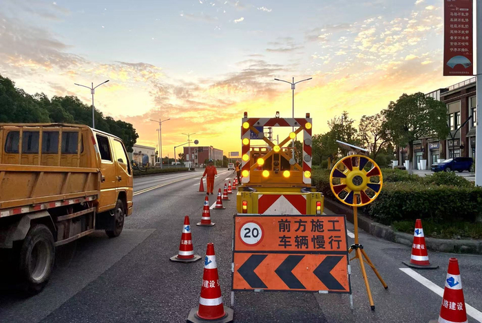 摆放交通警示标识。劳动报记者 贡俊祺 摄影“装沥青的车出来了,大家快把交通警示标志摆好!”5点10分,随着秦加强的一声大喊,众人迅速行动。