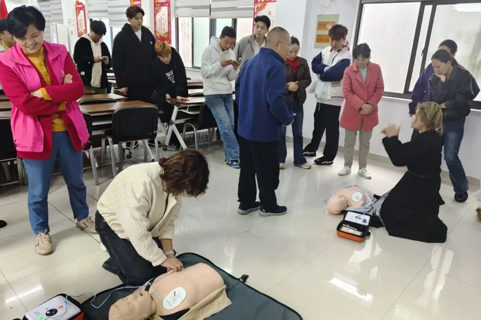 在随后开展的实操环节中,参训职工们学习热情高涨,在老师的专业指导下,依次利用模拟人教具和训练用AED设备,认真练习胸外按压、人工呼吸以及除颤仪的操作流程。老师则针对每位职工的操作姿势、力度频率等细节进行一对一纠正与指导,确保每位参与者都能真正学懂、会用。参与培训的职工纷纷表示,此次“送健康上门”的活动非常实用。“年底订单多、节奏快,学习这些急救技能特别有必要。万一遇到突发情况,我们不仅能自救,还能帮助别人。”