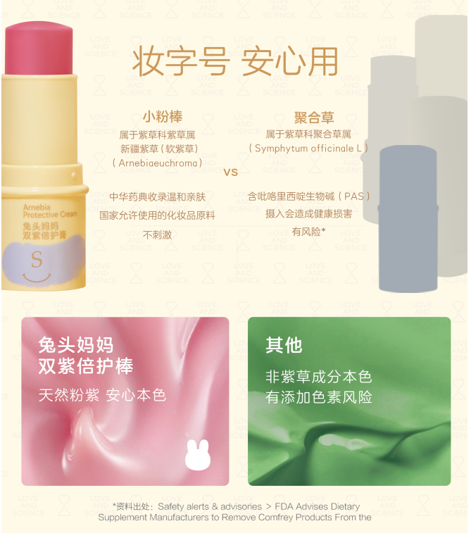 此外,通过原料的升级,兔头妈妈双紫倍护膏也向公众科普了一个理念:“紫草膏不是绿色,应该红到发紫”。中国传统的紫草,浸出的自然色泽应为红色至紫红色,而市面上热门的绿色紫草膏通常选用聚合草,两者同为紫草科,但却是不同属,形态完全不同,且安全性和功效大相径庭,聚合草对幼儿使用具有一定风险。正因如此,兔头妈妈坚持天然配方,逐步升级还原安心本色,让更多儿童用上安全又有效的紫草膏。