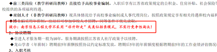 2021年4月,南京信息工程大学发布《高层次人才招聘启事(2022年)》,特别标注“提示:南京信息工程大学不采用‘非升即走’或类似招录模式,不实行竞争性淘汰。”