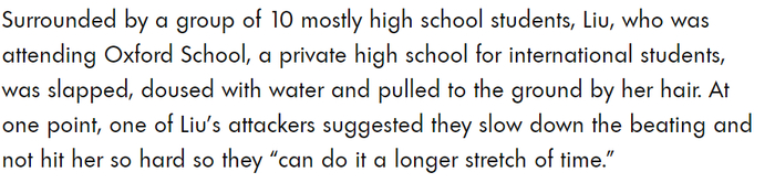 最近,随着韩国腹黑复仇剧《黑暗荣耀》第二季的热播,女主角在年少时期遭受的校园暴力片段也引起了人们的高度讨论,不禁让人想起8年前那个轰动全美的中国留学生霸凌案。