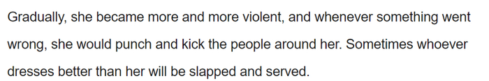 她变得越来越暴躁,一有不对劲就对身边的人施暴。有时候扇耳光的理由仅仅是因为有人穿得比她好。