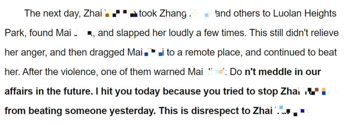 施暴后,其中一人警告Mai:“以后不要再插手我们的事情了。今天打你,是因为你昨天为了阻止翟某瑶打人。这是对翟某瑶的不尊重。”