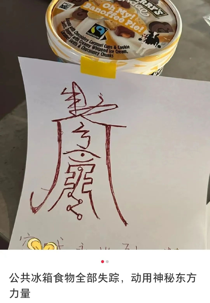 (图源:小红书 @酒酒啊酒酒,版权属于原作者)包括遇到自己的饭菜、冰箱食材被偷拿的情况,也用一道符纸巧妙“镇压”小偷👇