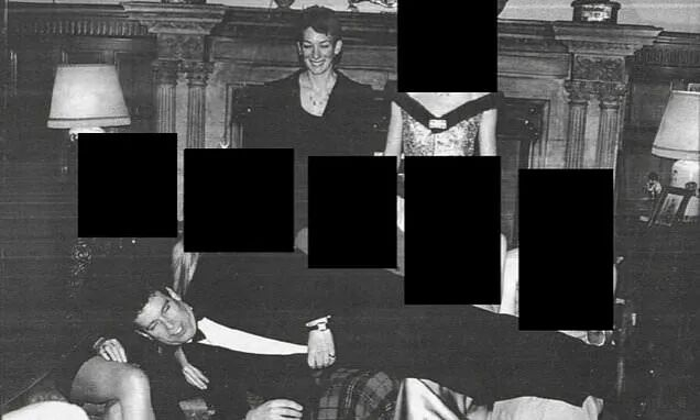 麦克斯韦尔站在旁边,一副见怪不怪的样子。照片里那些女性的脸都被打了马赛克,但这个姿势本身就已经够说明问题了。