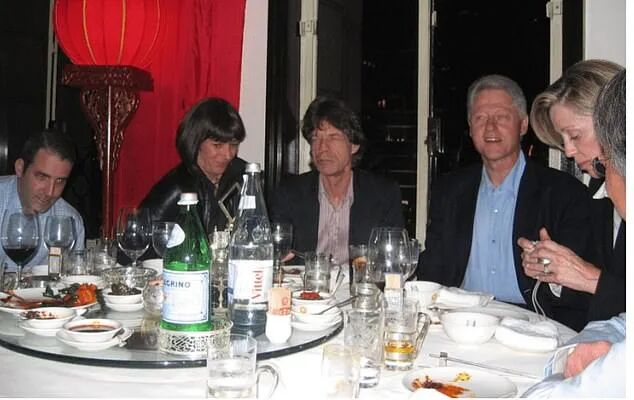 更劲爆的是一场私密晚宴的照片。克林顿、爱泼斯坦、麦克斯韦尔,还有滚石乐队传奇主唱米克·贾格尔(Mick Jagger)围坐一桌吃饭,看起来似乎是在吃中餐。