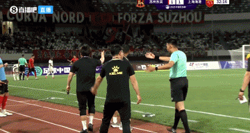 第32分钟,加布里埃尔边路带球自己滑倒了,主裁判吹罚了王夕杰犯规!王夕杰感到十分冤枉↓