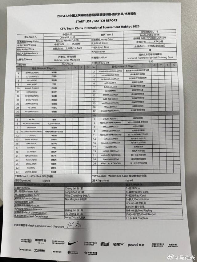 直播吧05月28日讯 北京时间19:35,呼和浩特国际足球锦标赛,中国男足U16对阵沙特阿拉伯男足U16,赛前双方首发阵容公布!