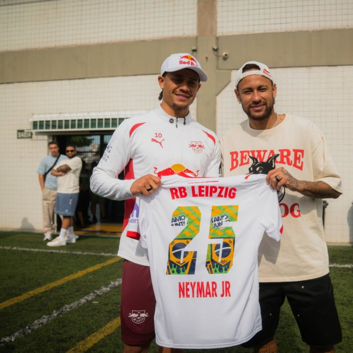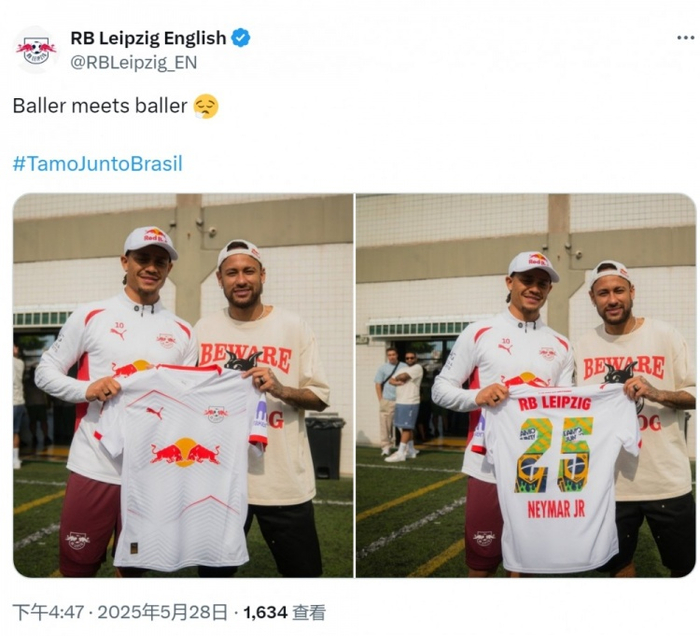 北京时间明天早晨,莱比锡将在友谊赛中对阵桑托斯,莱比锡攻击手哈维-西蒙斯与内马尔赛前见面,哈维-西蒙斯将莱比锡球衣赠送给这位巴西球星,球衣上面印有内马尔的名字。