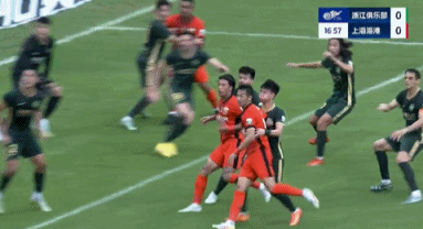 第22分钟,海港右侧传中到禁区,浙江队解围不远造成乱战,冯劲跟进抽射稍稍高出↓