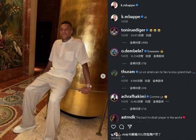 直播吧6月28日讯 正随皇马参加世俱杯的姆巴佩更新社媒,晒出自己在美国的多张照片,登贝莱、吕迪格、图拉姆、阿什拉夫等人进行互动,而登贝莱点赞该社媒。