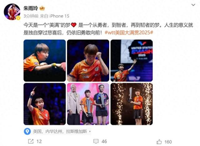 直播吧7月14日讯 朱雨玲更新社媒,庆祝自己拿到WTT美国大满贯女单冠军。