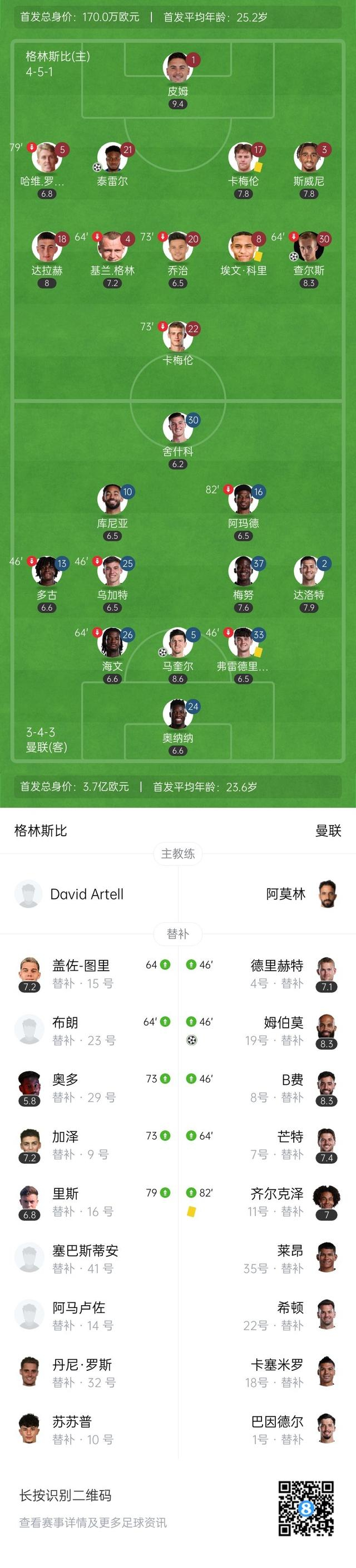 第89分钟,曼联左侧角球机会,皮球主罚到后点,马奎尔头球绝平,曼联2-2格林斯比↓