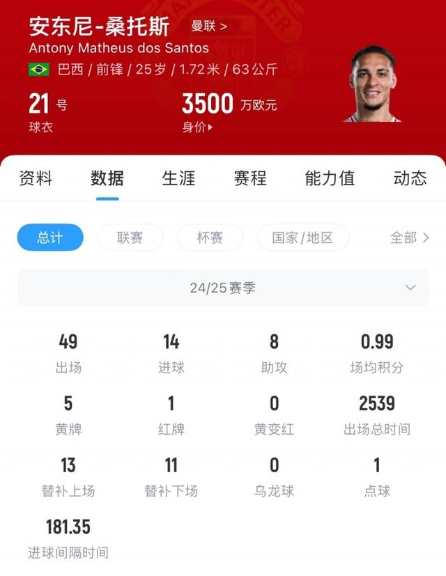 25岁的安东尼2023年8月加盟曼联,总价9500万欧。效力曼联至今,球员出战96场收获12球5助。