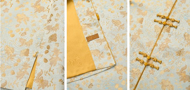 而细节之处,无论是精选的天然黄玛瑙玉石扣,还是寓意“福禄”的葫芦装饰及配色考究的真丝里布,均是对品质追求的展现,更是对文化深度的一次深情致敬。内里缝制钱小萍宋锦坊限量专属织标,彰显非遗大师面料的品质属性。
