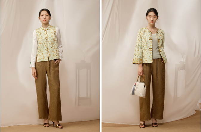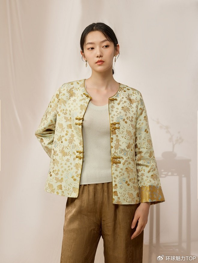《锦·秋》系列新品,作为T&A天嘉爱对非物质文化遗产宋锦的现代诠释,不仅精妙地保留了其历史底蕴与传统韵味,更在钱小萍大师的精研面料上,勇敢跨越时空界限,融入了现代极简风格的设计思潮。形象款的廓形设计线条流畅,追求包容与修身的融合,每一道线条都承载着对中式古典美学的深刻理解与现代审美视角的精准捕捉。