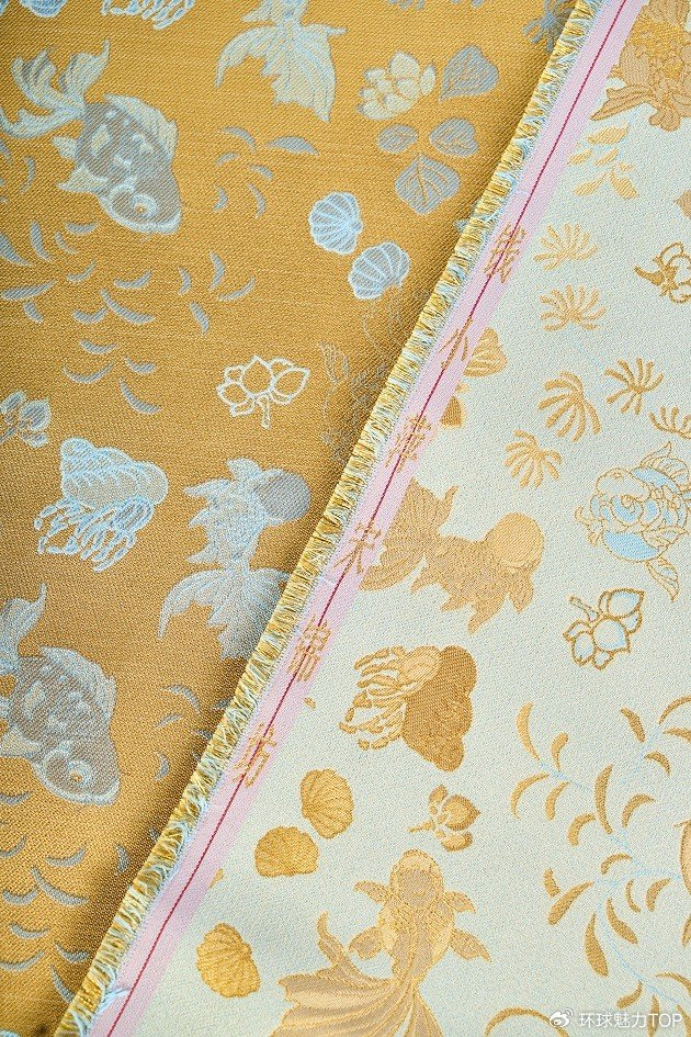 宋锦,作为中国四大名锦之一,以其精湛的工艺、华丽的图案和深厚的文化底蕴闻名于世,被誉为“锦绣之冠”。 2006年,宋锦被列入第一批国家级非物质文化遗产名录;2009年9月联合国教科文组织保护世界非物质文化遗产政府间委员会又将宋锦列入了世界非物质文化遗产。 T&A天嘉爱匠心呈献华裳系列《锦·秋》新品,深植于国家级非物质文化遗产宋锦的千年织艺精髓,形象款特别选用了国家级非物质文化遗产项目宋锦织造技艺代表性传承人钱小萍大师精研的金鱼水藻纹宋锦面料,一针一线皆是对精湛技艺与文化传承的致敬。