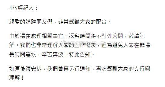 经纪人称小S也理解大家的工作需求,但为了避免大家在机场长时间等候,辛苦奔波,特此告知。