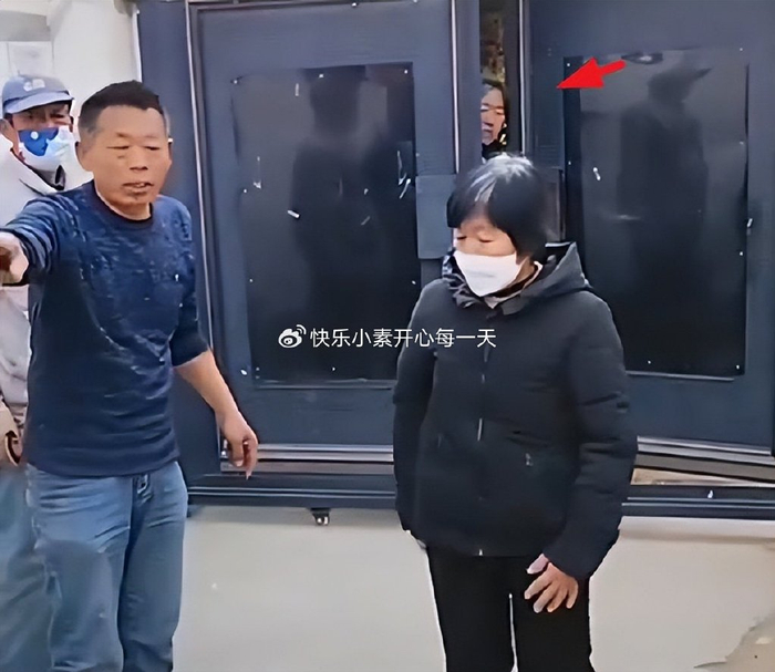 身后的大衣嫂被逼无奈,连门都不敢出,开着门缝查看大门外面的情况。