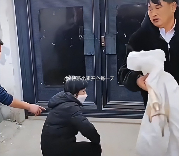 此时跪着的大姨看到大衣哥突然起身,准备拽着大衣哥要钱。