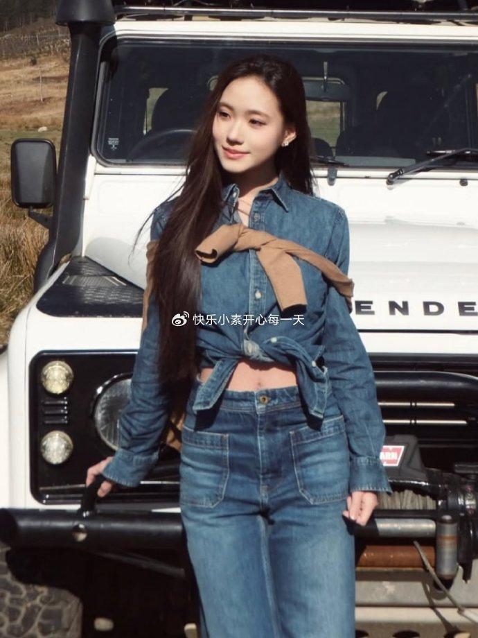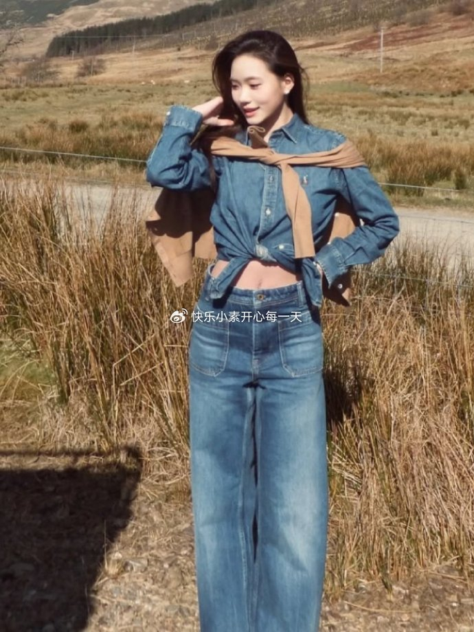 镜头中的Lily穿着牛仔套装,认真站在国外的风景线上拍摄个人照片。