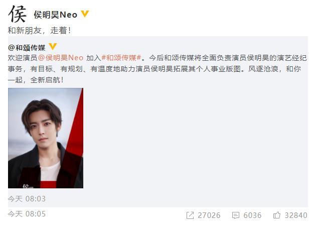 侯明昊加盟和颂传媒,成为李冰冰、赵丽颖公司旗下的艺人。