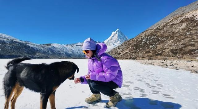 大约30分钟就能走到湖边,但返程爬坡的话需要1个小时!湖边结了厚厚的冰,人可以走进去,漫步在冰湖上,背后是三角形的库拉冈日主峰,十分壮观,捧起湖面的雪往空中一撒,雪花漫天,非常浪漫,阳光直射的时候,在这玩雪一点不冷,要是换在东北,手根本不敢伸出来!
