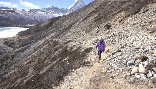 介九措全程6.5公里,海拔总爬升350米,起点处的海拔是4500米,最高点是4750米,一开始就是4个绝望坡,每一个坡都有50多米,像阶梯一样逐层升高。