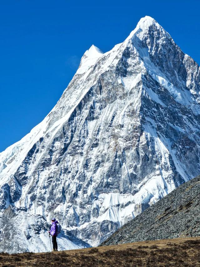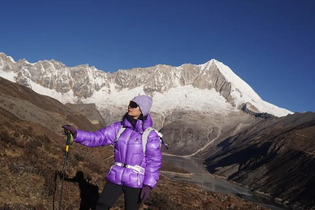 库拉冈日雪山就在身侧,巨大的雪山极具压迫感,你可以清晰的看到山的褶皱和雪的倾泻状态,用长焦便可以拍出人在雪山中行走的照片,非常震撼!很少有一个地方,可以让你和7000多米的雪山如此靠近!