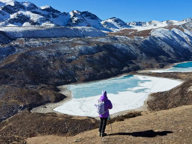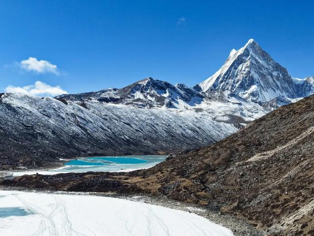 大约2个小时就能抵达4750米海拔的山脊线,站在山脊线上居高临下,可以俯瞰雪山下的介九措,一半已经结冰,还有一些湛蓝色的湖水鲜活着,在雪山和阳光的反射下,像绿松石波光粼粼!