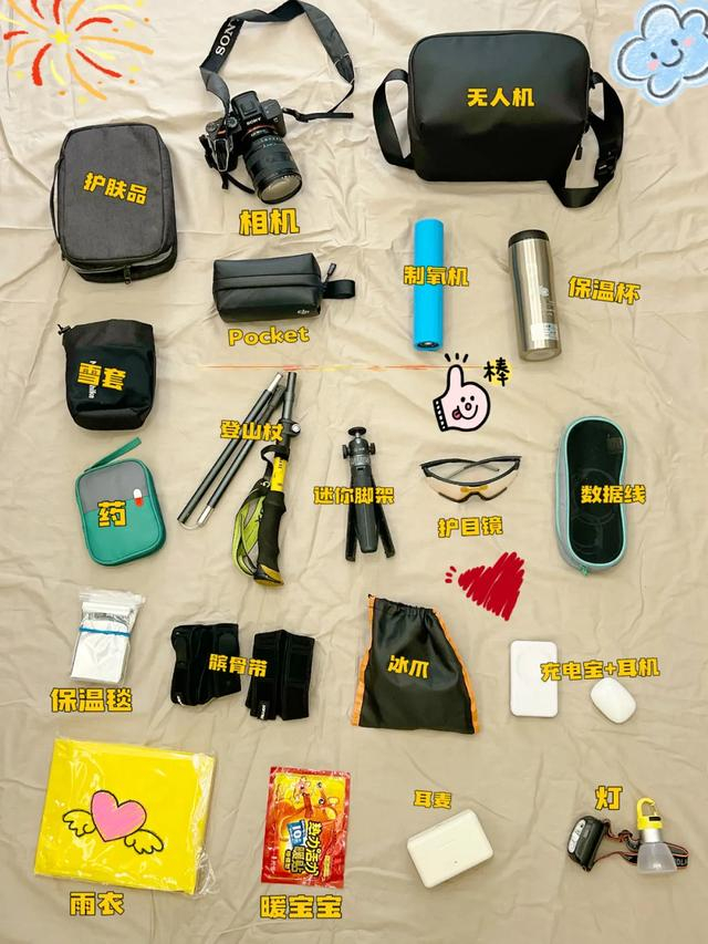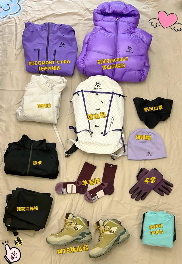 1、装备清单:专业雪山羽绒+抓绒+速干保暖层,一件硬壳冲锋衣备用,冷帽、抓绒手套、高邦登山鞋、登山杖、防晒口罩、护目镜、登山包;