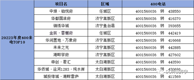搜狐焦点济宁站2023年来电量排名前10的房地产项目分别为:中垠·铂悦府、华都国滨府、锦绣华城、 金辰·雲樾府、华润置地·万象府、未来之光、湖畔学府、申创·君汇、 华侨城·运河1283·纯水岸、城投绿城·湖畔雲庐等。