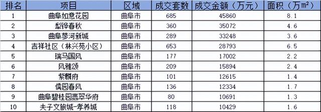 曲阜市住宅销售业绩TOP10
