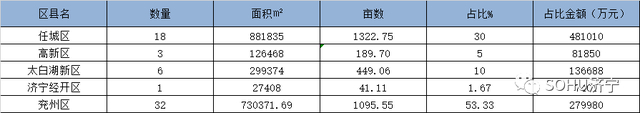 任城区:18宗,面积881835平方米,约合1322.75亩,占总面积的42.70%;