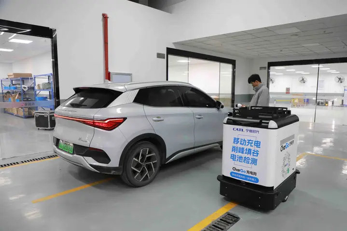 2月10日,记者在东侨宁家服务中心见到,一台一米多高的“移动电池”自动“跑到”新能源车旁,为车辆开启充电作业。这是我市首台上岗的CharGo充电狗,由宁德时代旗下酝电智能科技研发的全场景移动式储充检一体机器人。