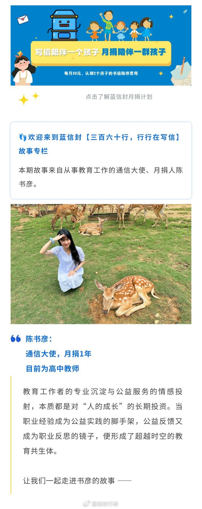 大学时期的支教经历让我对公益产生了深厚的兴趣,但工作后,我发现自己的时间变得有限,无法像以前那样投入大量精力进行实地支教。这时,我发现了“蓝信封”项目,通过书信的方式与乡村孩子保持联系。这种方式既方便又能给予孩子们情感上的支持,于是我毫不犹豫地成为了通信大使。
