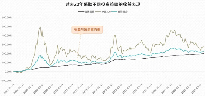 ③ 稳健型组合(股20%+债80%):年化收益较低,但组合波动也最低,适合比较保守、追求稳健收益的投资者。
