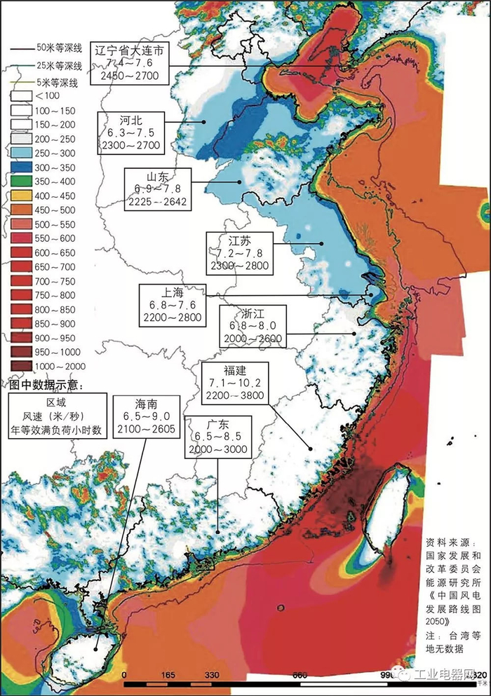 我国海岸线长约一万八千多千米,岛屿六千多个,相对于陆地,我国近海风能资源更为丰富。根据中国气象局近期对我国风能资源的详查和评价结果,我国近海100米高度层5~25米水深区风能资源技术开发量约为2 亿千瓦,5~50米水深区约为5亿千瓦。