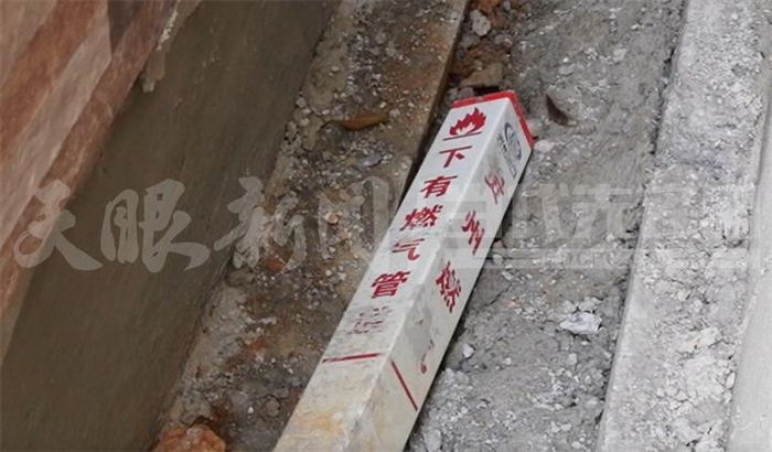 跟随小区业主们的指引,记者又来到一楼的另一边。“你看这堵墙,是两户占了绿化搭建的隔离墙,在挖掘的凹槽里,燃气警示标志已经被挖断。我们大家用的燃气管道有没有被占用,不得而知。”记者在现场看到,的确有数根警示标志被破坏,草坪被践踏。