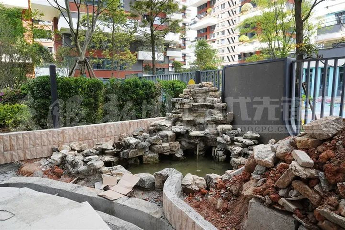 据刘先生描述,该栋一楼原本有一处景观栅栏,但一楼住户私自将栅栏拆除后在原地修建了一处池塘,一旁则搭建了阳光房。“这家住户与博誉致德幼儿园相邻,在阳台另一边,这户阳台与幼儿园之间应该是有绿化带相隔的,但是业主却将自家阳台向外扩展,将房屋与幼儿园之间的绿化带侵占,修建了属于他自己的假山鱼池。”刘先生说。