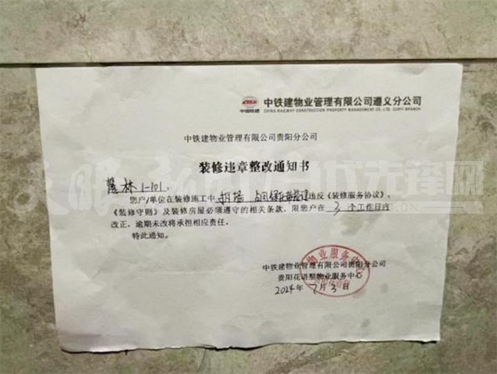 2024年6月21日,工作人员对该号房张贴装修违章整改通知书,同时告知户内装修负责人禁止违规行为,对方未予理会。