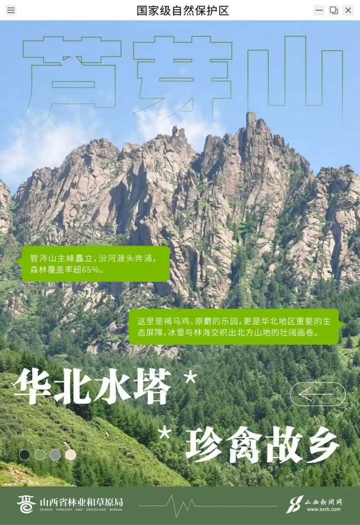 在山西的群山褶皱里,灵空山、芦芽山、太宽河等八处国家级自然保护区,如同八座生态方舟,守护着华北地区珍贵的动植物种群与原始地貌。它们是太行吕梁的生态脊梁,是黄河汾水的源头屏障,更是三晋大地人与自然共生的鲜活注脚。