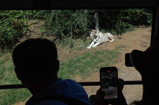 在酋长之家和草原探险基地,依托专业设计的游览动线和科普讲解,游客可乘坐特制车辆与动物亲密互动。来自北京的李女士分享道:“白虎趴在车顶,仅隔着一扇车窗,投喂时超级刺激,还看到了会站起来转圈索要苹果的大棕熊,这种近距离接触动物的体验非常特别。”