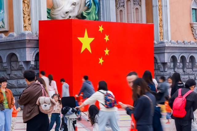 “水下红旗秀”更是国庆演艺期间的亮点。多名潜水员在湛蓝的池水中舞动或巡展巨幅国旗,通过独特而鲜活的形式为祖国庆生,这种难以言喻的美和力量感正是“中国式浪漫”的具象化显现,每一次演出都会吸引无数游客拍照,成为社交媒体上广泛传播的精彩瞬间。
