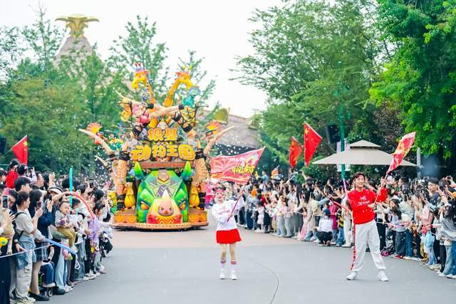 当成千上万的游客手持免费赠送的小红旗走入园区,节日氛围瞬间点燃。银基动物王国的国庆版花车巡游、夜间星光巡游在烟雨中照常进行,演员们热情不减地与游客互动。动物百老汇剧场每日加演至四场,特别设置的“千人合唱红歌”环节引发全场共鸣。“虽然大家素不相识,但全场一起挥舞红旗参与大合唱,那种情不自禁的感动,让人觉得不虚此行。”一位河北游客动情地说。