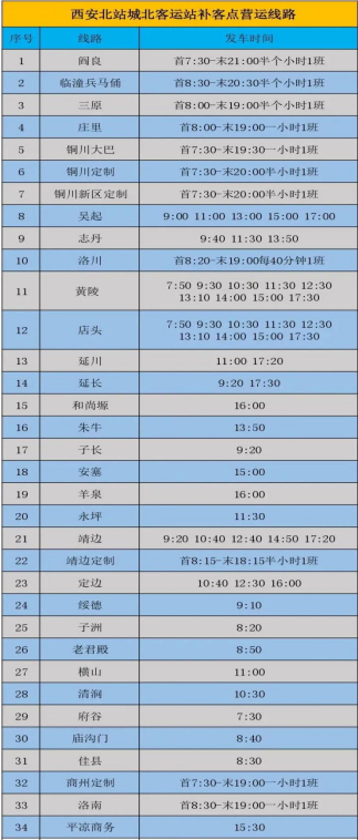 目前西安北站城北客运站补客点有开往咸阳、渭南、商洛、铜川、延安、榆林、甘肃等34个方向的班线,遇节假日班车有所变动,具体时间以当天发班为准。