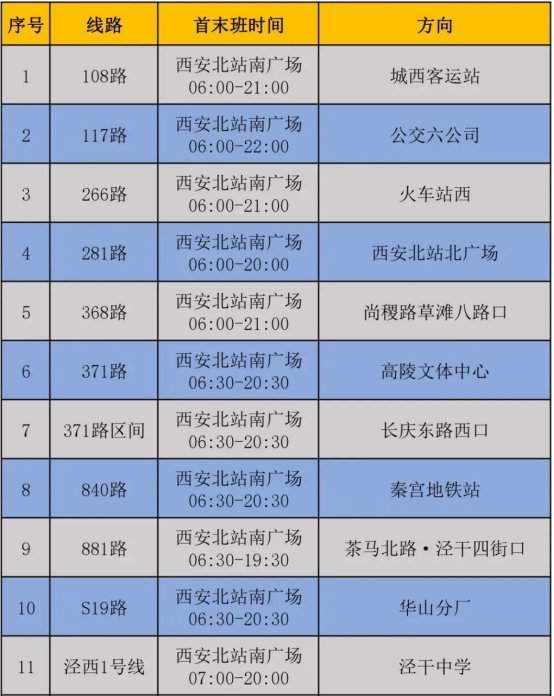 西安北站南广场公交站(元光路、元光东路)有108路、266路、281路、368路、泾西1号线等共计11条公交路线。