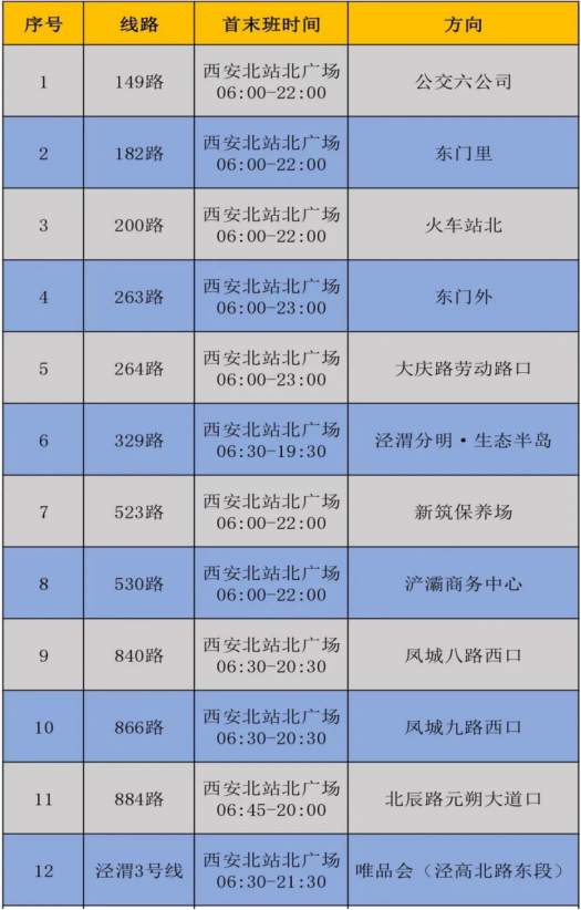西安北站北广场(秦汉大道)有149路、182路、200路、263路、泾渭3号线等共计12条公交路线。
